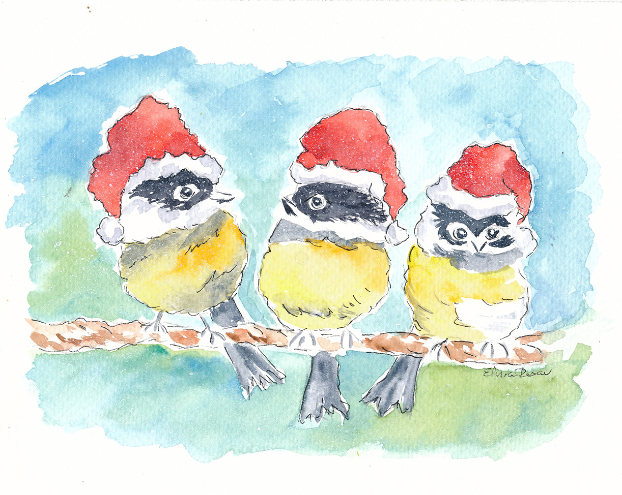“Chickadees with Santa Hats” — Original Watercolor Painting