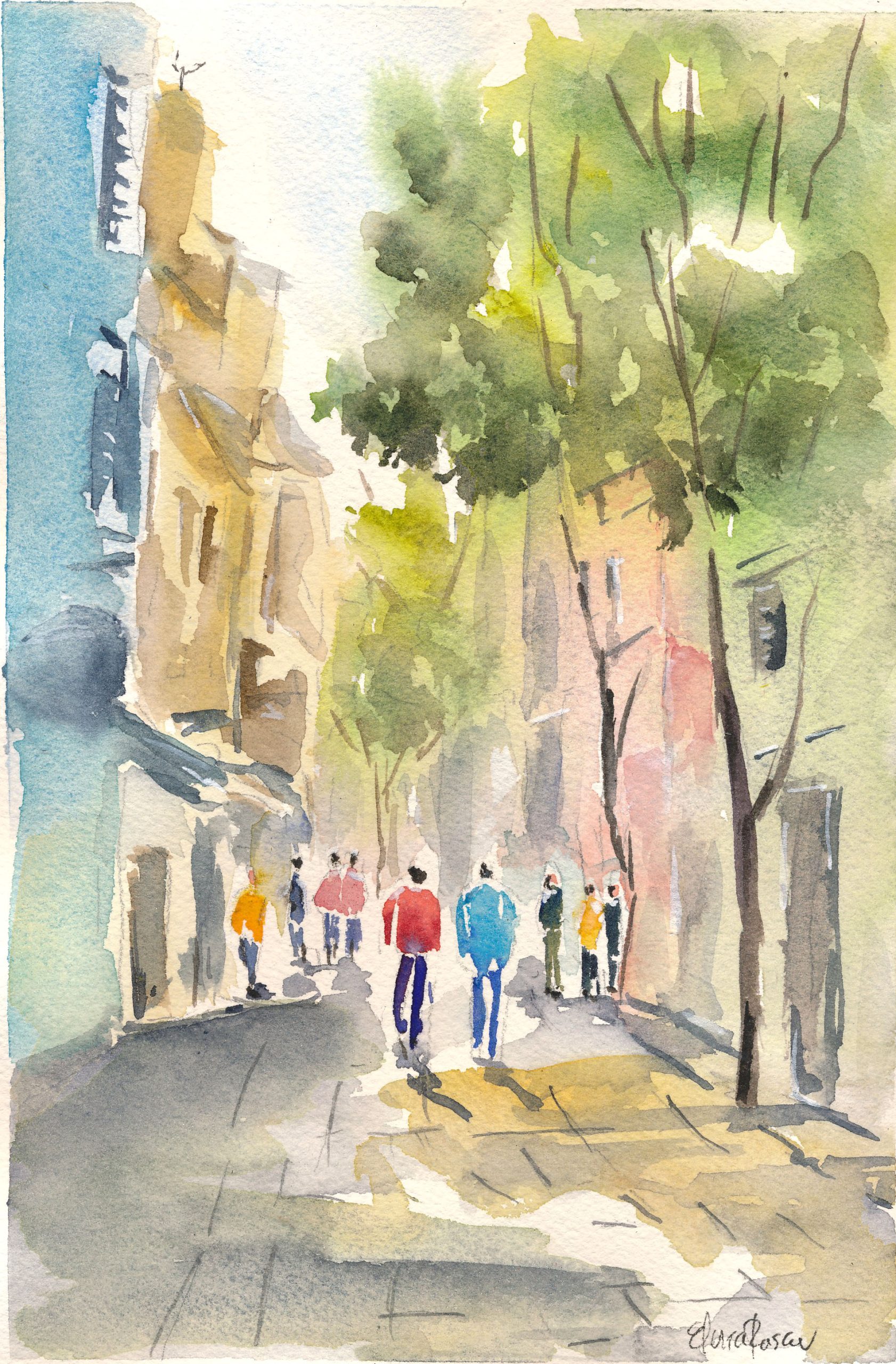 Category: Watercolor Paintings Tags: City escape original watercolor by Elvira Rascov, city scene original watercolor by Elvira Rascov, In the city original watercolor by Elvira Rascov