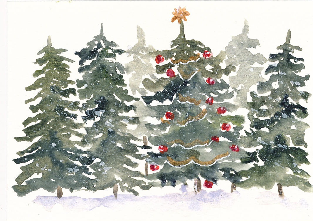 Original watercolor artwork featuring pine trees and a decorated Christmas tree